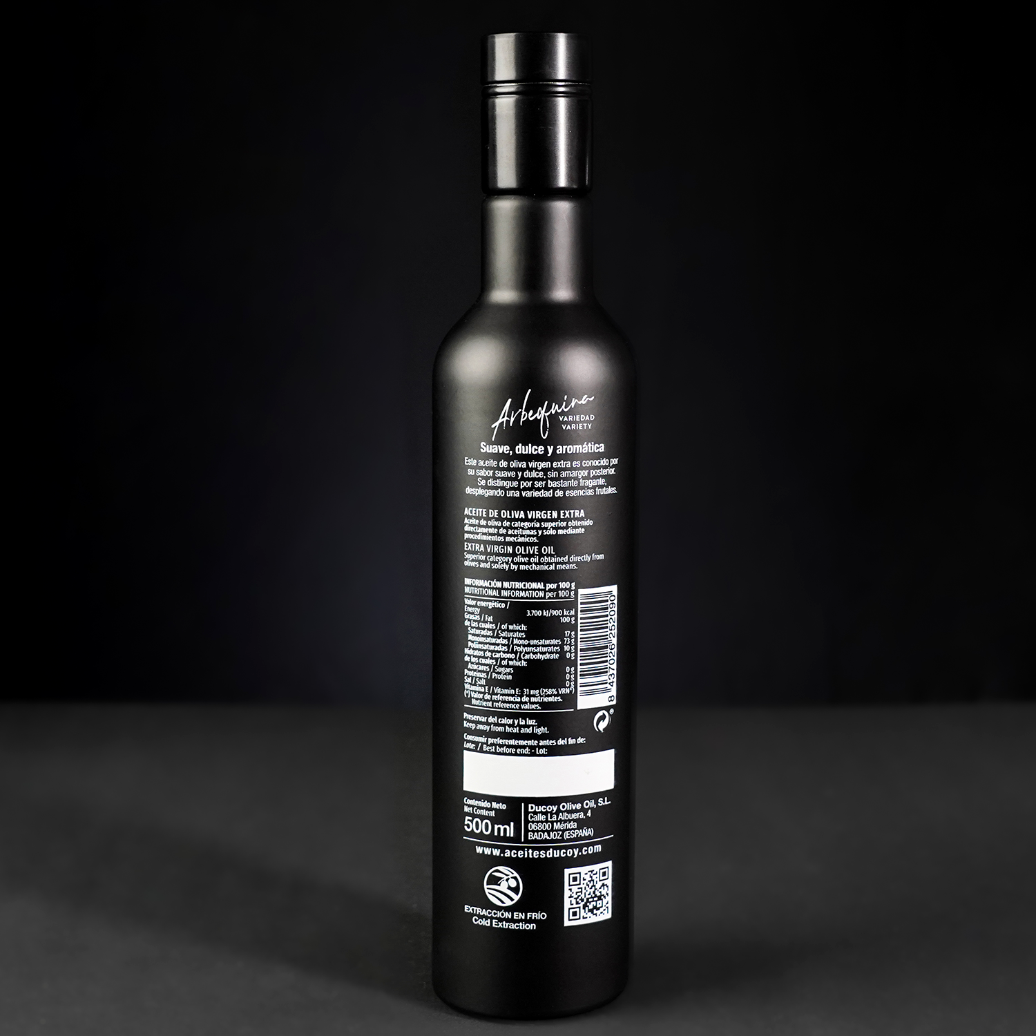 El aceite de oliva virgen extra monovarietal arbequina es recolectado en su punto óptimo de maduración, y se caracteriza por ser un frutado maduro aromático.