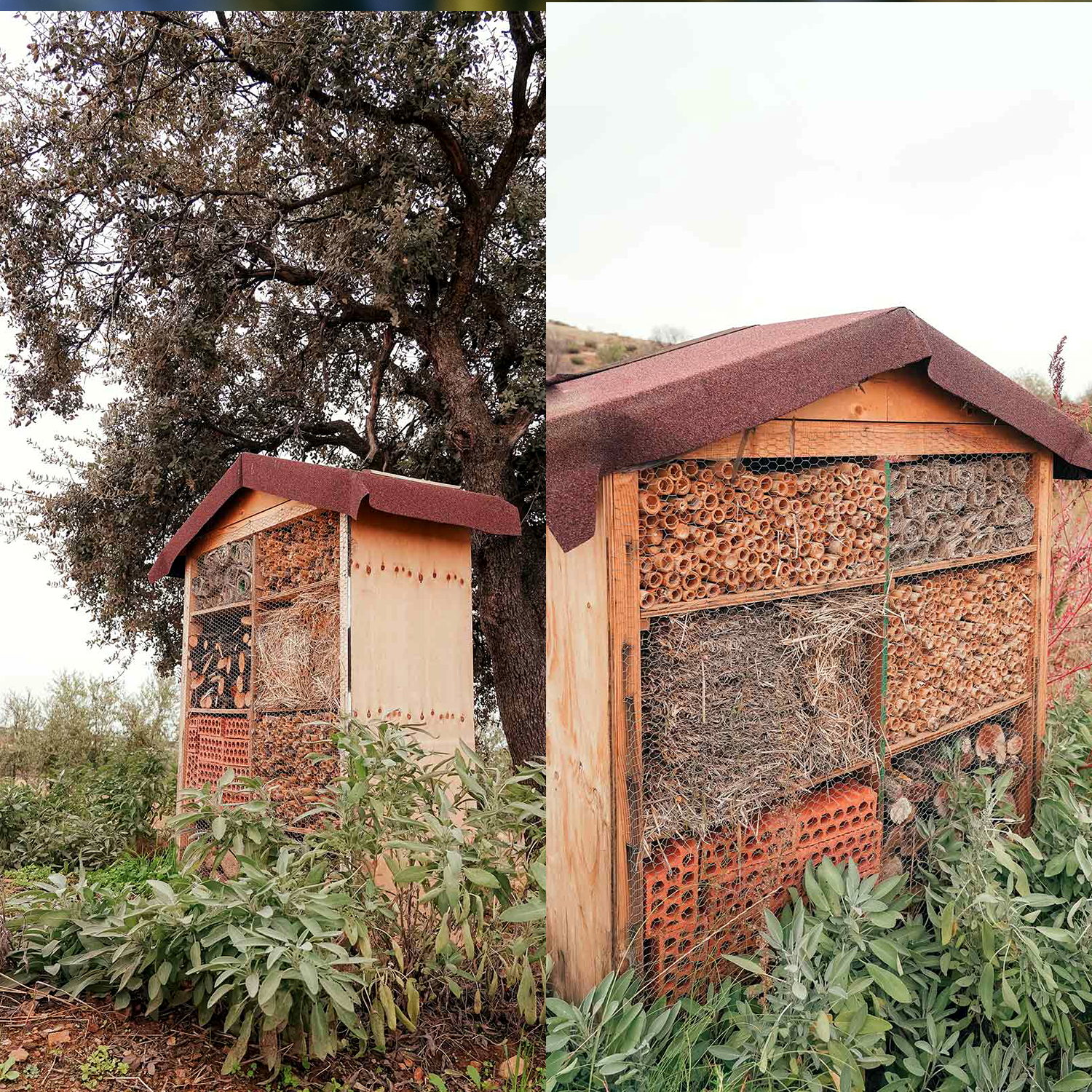 Los hoteles para insectos, construidos con materiales naturales, atraen a la fauna autóctona y fomentan su reproducción. Las crisopas, avispas, abejas silvestres y mariquitas disfrutan de un buffet libre de néctar y polen, ayudando a controlar las plagas de manera natural.